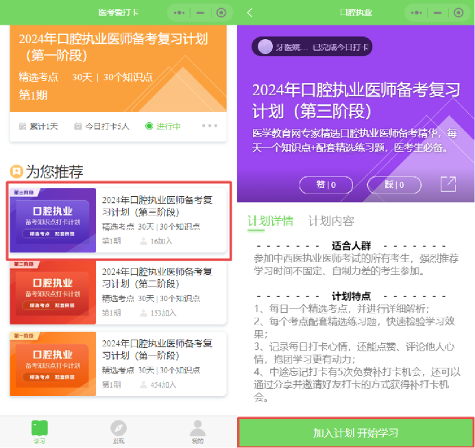 請選擇“您的備考計劃”,如口腔執(zhí)業(yè)醫(yī)師備考復(fù)習(xí)計劃(第三階段),然后點(diǎn)擊下方“加入計劃開始學(xué)習(xí)”按鈕,開始正式進(jìn)入打卡學(xué)習(xí);