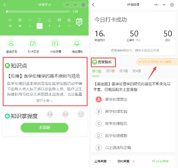 醫(yī)考愛打卡是由醫(yī)學(xué)教育網(wǎng)專業(yè)老師經(jīng)多年總結(jié)整理出的考點(diǎn),并且每個考點(diǎn)都會有對應(yīng)的習(xí)題進(jìn)行檢驗掌握成果,目的是查缺補(bǔ)漏,做完可以查看錯題集錦以及答案解析。