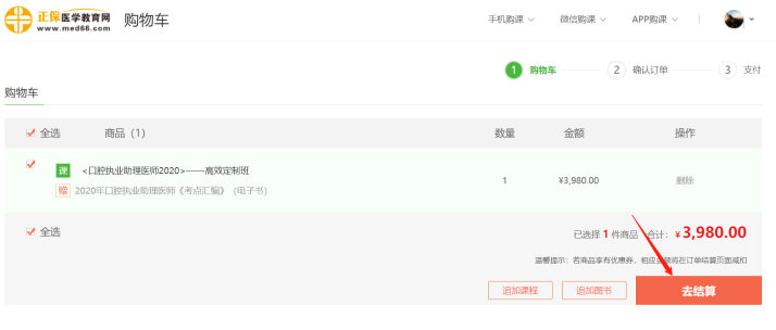 第二步:在購(gòu)物車內(nèi)確認(rèn)已選課程,確認(rèn)無誤后點(diǎn)擊“去結(jié)算”;