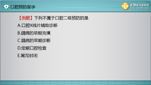 二級預(yù)防(secondary prevention)(臨床前期預(yù)防):早發(fā)現(xiàn),早診斷,早治療。定期口腔健康檢查、高風(fēng)險人群的發(fā)現(xiàn)和早期齲齒充填等。