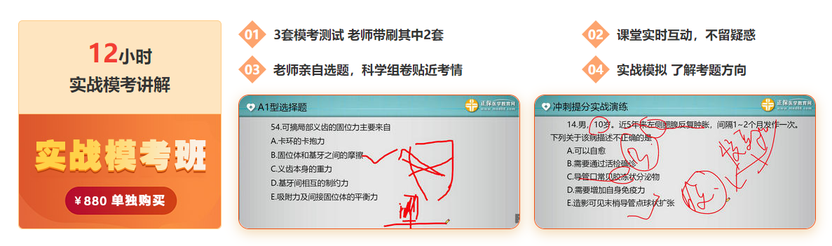 2021年醫(yī)師沖刺突破班課程包含刷題密訓(xùn)和實戰(zhàn)??純纱箅A段課程,其中刷題階段由網(wǎng)校老師直播授課,圍繞考綱甄選1000多道代表性試題進行講解,以題帶點,以點帶面,考點鞏固,學(xué)練結(jié)合,達到應(yīng)試水平。實戰(zhàn)??茧A段由網(wǎng)校專業(yè)師資親自選題,組3套卷,其中老師帶刷其中1套卷,幫助大家實戰(zhàn)模擬,了解試題方向!