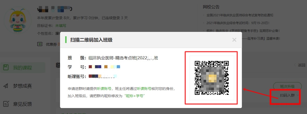 電腦端:購課之后,登錄m.tymfj.cn,進(jìn)入我的網(wǎng)校我的家,點(diǎn)擊“掃碼入群”即可掃碼入群,添加班主任老師好友,提供聽課賬號(hào),等待入群。審核通過之后會(huì)及時(shí)拉您入班級(jí)群,跟同班同學(xué)一起備考!