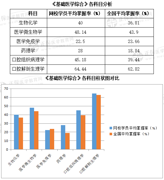 (2)《口腔臨床醫(yī)學綜合》這個模塊,屬于考試的重中之重,也是考試所占分值最大的一個模塊。根據網校學員各科目掌握率進行分析,仍然是兒童口腔醫(yī)學正確率偏低,與全國考生掌握率相似,所以判斷兒童口腔醫(yī)學2021年考試難度應該較大。其余幾個科目學員個人掌握率均>全國掌握率,說明網校學員對于這幾門課程的掌握還是比較牢固的。因此在以后的學習中,網校會針對兒童口腔醫(yī)學的課程內容講解以及題目的內容進行相應的更新,將課程內容講解的更加細致。