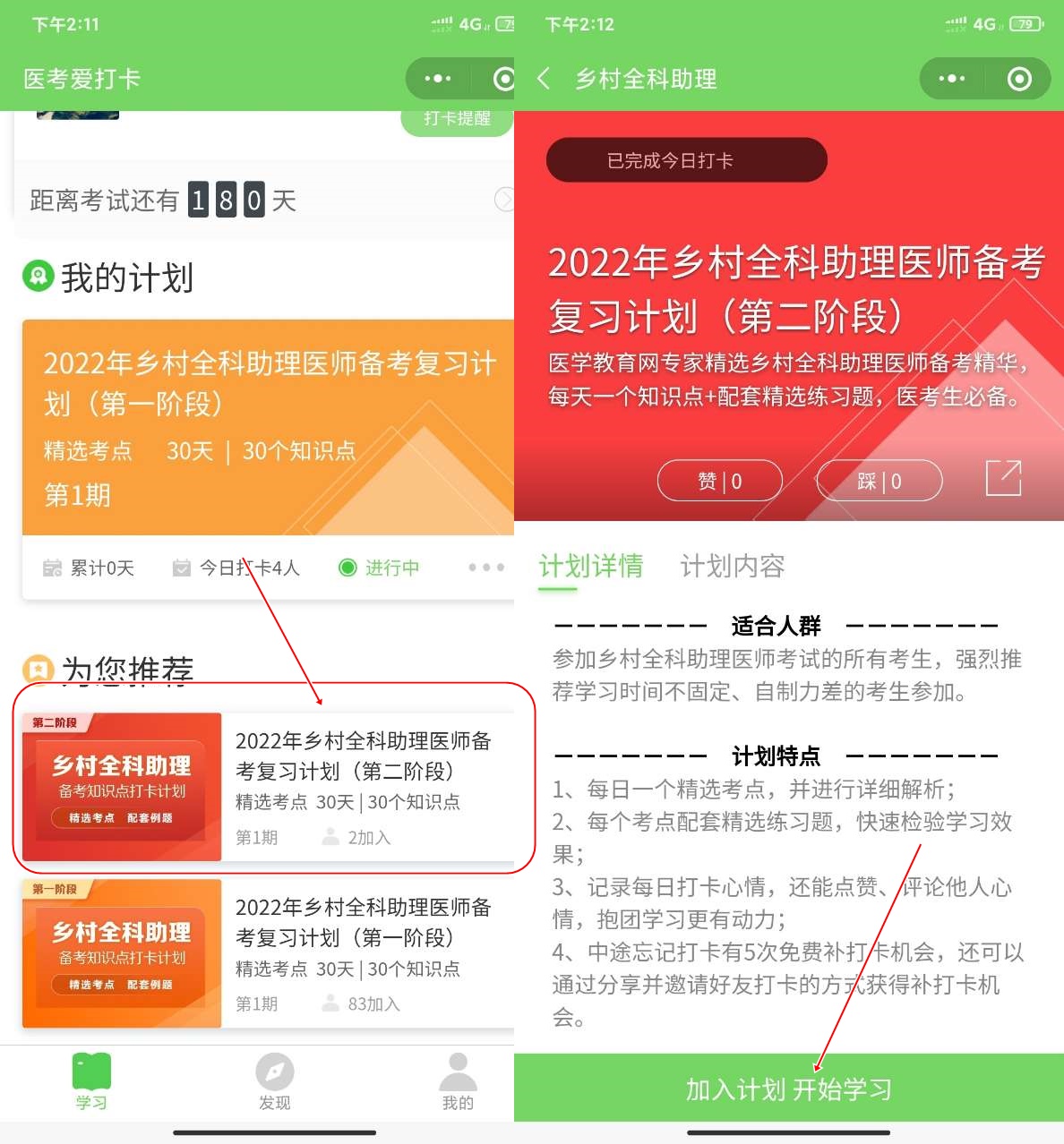 第三步:選擇備考科目后即進(jìn)入學(xué)習(xí)計(jì)劃選擇的頁面,請選擇“您的備考計(jì)劃”,如口腔助理醫(yī)師備考復(fù)習(xí)計(jì)劃(第二階段),然后點(diǎn)擊下方“加入計(jì)劃 開始學(xué)習(xí)”按鈕,開始正式進(jìn)入打卡學(xué)習(xí)。