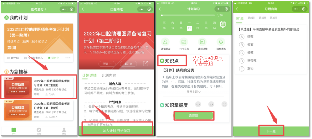 (1)選擇計(jì)劃+加入計(jì)劃,先學(xué)習(xí)知識(shí)點(diǎn),再去答題;