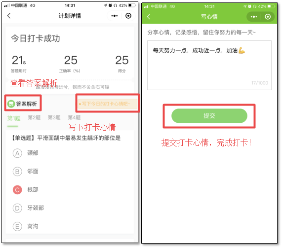 (2)查看測試結(jié)果+答案解析+分享今日打卡心情,提交完成打卡