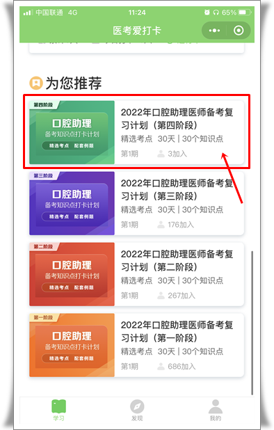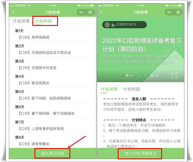 如口腔助理醫(yī)師備考復(fù)習(xí)計(jì)劃(第四階段),然后點(diǎn)擊下方“加入計(jì)劃 開始學(xué)習(xí)”按鈕,開始正式進(jìn)入打卡學(xué)習(xí)。
