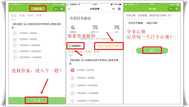 (3)查看測(cè)試結(jié)果+答案解析+分享今日打卡心情,提交完成打卡