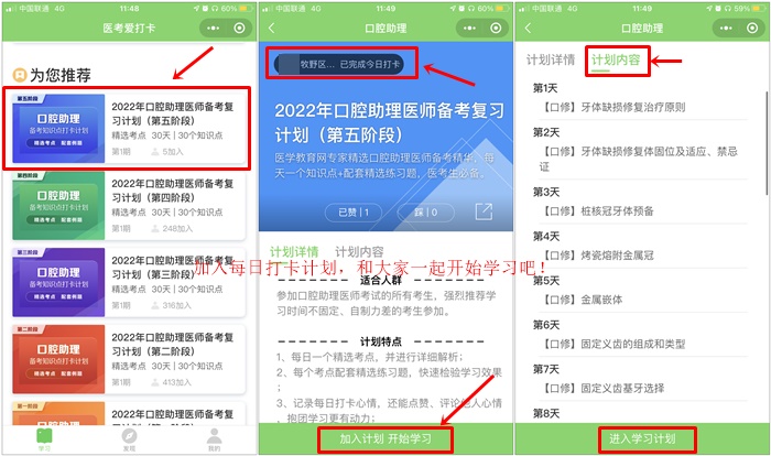 如口腔助理醫(yī)師備考復(fù)習(xí)計(jì)劃(第五階段),然后點(diǎn)擊下方“加入計(jì)劃 開始學(xué)習(xí)”按鈕,開始正式進(jìn)入打卡學(xué)習(xí)。