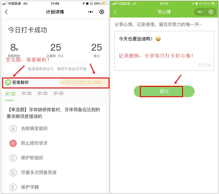 (3)查看測(cè)試結(jié)果+答案解析+分享今日打卡心情,提交完成打卡