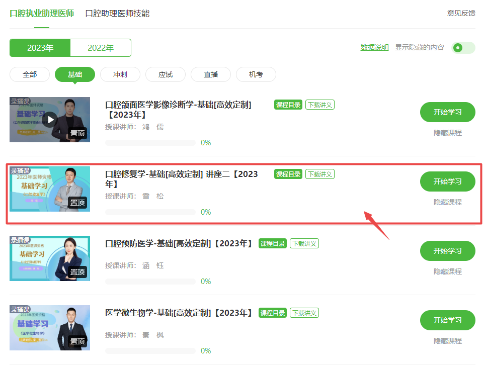 2023年醫(yī)師備考全面開啟!2023年口腔助理醫(yī)師基礎學習新課開通!目前由雪松老師授課的《口腔修復學》科目課程已更新完畢!已購課同學可以直接進入我的網(wǎng)校我的家-我的課程-口腔修復學科目進行學習!2023年口腔助理醫(yī)師《口腔修復學》考試大綱/教材具體內容如下。未購課學員點擊此處進入選擇課程>,具體看課位置如下: