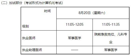 醫(yī)學(xué)綜合考試:考試實行計算機化考試,軍隊現(xiàn)役人員加試軍事醫(yī)學(xué)、院前急救崗位和兒科專業(yè)加試相應(yīng)內(nèi)容。統(tǒng)一考試時間如下: