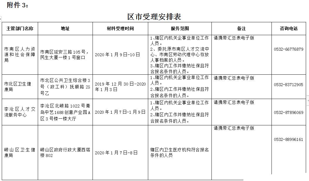 在各區(qū)市有關(guān)部門服務(wù)范圍內(nèi)的報(bào)考人員,可按照《區(qū)市受理安排表》(詳見附件3)的要求在規(guī)定時間內(nèi)到指定地點(diǎn)提交材料;有關(guān)主管部門所屬單位報(bào)考人員,應(yīng)按照主管部門要求提交材料。