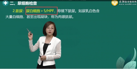 膿尿:尿白細胞>5/HPF,稱鏡下膿尿。如尿乳白色含大量白細胞,甚至出現(xiàn)凝塊,稱為肉眼膿尿。
