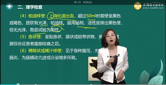 柏油樣便:上消化道出血,超過50ml時(shí)糞便呈黑色或褐色,質(zhì)軟有光澤,柏油樣。服用鉍劑、活性炭排出黑色便,但無光澤,隱血試驗(yàn)為陰性。