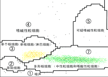 血液與酸性表面活性劑反應(yīng),不僅紅細胞溶解,而且除嗜堿性粒細胞外,其他所有白細胞膜均被破壞,胞質(zhì)溢出,僅剩裸核。當激光束照射到細胞時,產(chǎn)生不同強度的散射光,形成二維細胞圖,其中,嗜堿性粒細胞呈高狹角散射,定位于細胞圖上部,裸核細胞則位于細胞圖下部。