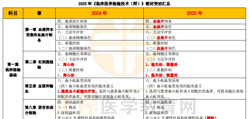 2025年《臨床醫(yī)學(xué)檢驗技術(shù)(師)》教材公布了,經(jīng)醫(yī)學(xué)教育網(wǎng)專業(yè)教務(wù)校對發(fā)現(xiàn)了部分變動,具體內(nèi)容如下 :