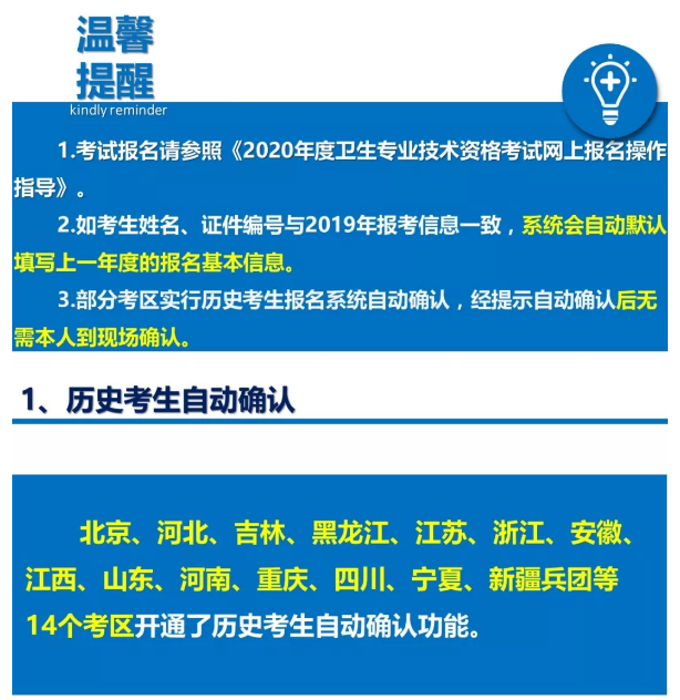 答:2020年度衛(wèi)生專業(yè)技術(shù)資格考試北京、河北、吉林、黑龍江、江蘇、浙江、安徽、江西、山東、河南、重慶、四川、寧夏、新疆兵團(tuán)考區(qū)開通了歷史考生自動(dòng)確認(rèn)。