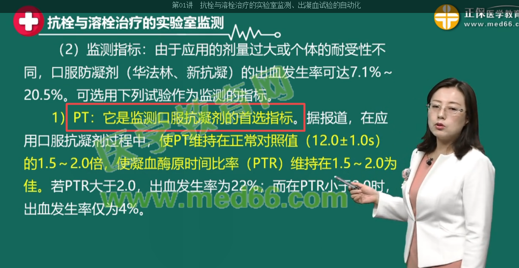 4.PT:它是監(jiān)測(cè)口服抗凝劑的首選指標(biāo)。據(jù)報(bào)道,在應(yīng)用口服抗凝劑過(guò)程中,使PT維持在正常對(duì)照值(12.0±1.0s)的1.5~2.0倍,使凝血酶原時(shí)間比率(PTR)維持在1.5~2.0為佳。