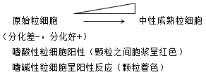 原粒胞漿光鏡下無顆粒。所以POX陰性??疾煜矚g出這類題,哪個最強或最弱。嗜酸陽性反應(yīng)的程度強。酸梅主要兩點;粒系相關(guān)的酶;隨著細胞成熟,陽性反應(yīng)增強。