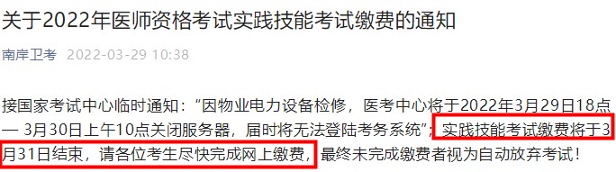 接國(guó)家考試中心臨時(shí)通知:“因物業(yè)電力設(shè)備檢修,醫(yī)考中心將于2022年3月29日18點(diǎn)— 3月30日上午10點(diǎn)關(guān)閉服務(wù)器,屆時(shí)將無(wú)法登陸考務(wù)系統(tǒng)”;實(shí)踐技能考試?yán)U費(fèi)將于3月31日結(jié)束,請(qǐng)各位考生盡快完成網(wǎng)上繳費(fèi),最終未完成繳費(fèi)者視為自動(dòng)放棄考試!