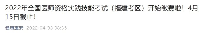 福建泉州惠安考點(diǎn)2022年臨床執(zhí)業(yè)醫(yī)師技能網(wǎng)上繳費(fèi)公告發(fā)布,4月15日截止繳費(fèi)!請各位考生注意、相互轉(zhuǎn)告,別錯過繳費(fèi)時間哦!