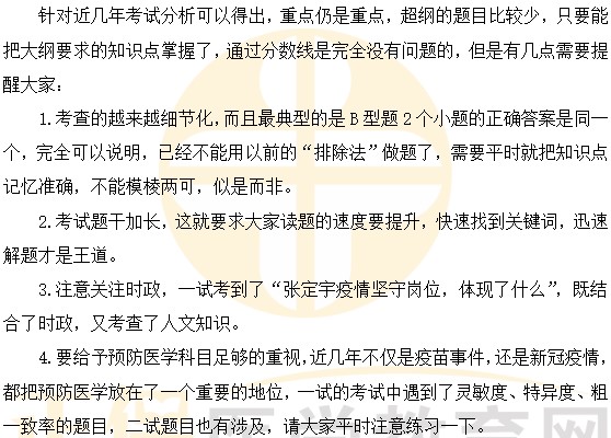 3.明顯可以感覺到考試題目越來越靈活,越來越細節(jié)化,屬于大綱之內(nèi),卻又容易讓大家忽略,比如:“出牙12顆,問小兒的年齡”“黎明現(xiàn)象的原理”,仔細想想其實此知識點課上講過,只是需要大家換一個思路考慮。