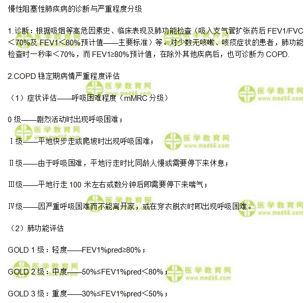 關(guān)于臨床執(zhí)業(yè)醫(yī)師《呼吸系統(tǒng)》:慢性阻塞性肺疾病的診斷與嚴(yán)重程度分級,相關(guān)考點(diǎn),相信備考2020年臨床執(zhí)業(yè)醫(yī)師考試的考生都在關(guān)注,為方便大家學(xué)習(xí),在此醫(yī)學(xué)教育網(wǎng)小編為大家整理如下內(nèi)容: