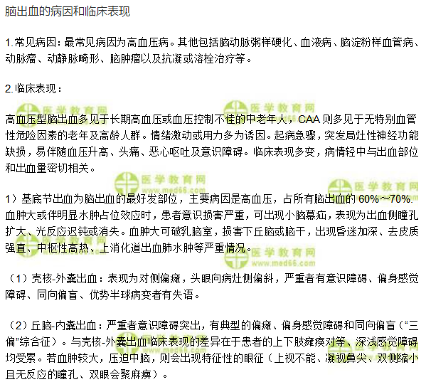 針對(duì)臨床執(zhí)業(yè)醫(yī)師精神神經(jīng)系統(tǒng)中“腦出血的輔助檢查、診斷治療和預(yù)防”相關(guān)考點(diǎn),相信大家都在認(rèn)真學(xué)習(xí),為提高備考效率,在此醫(yī)學(xué)教育網(wǎng)小編為大家整理如下內(nèi)容: