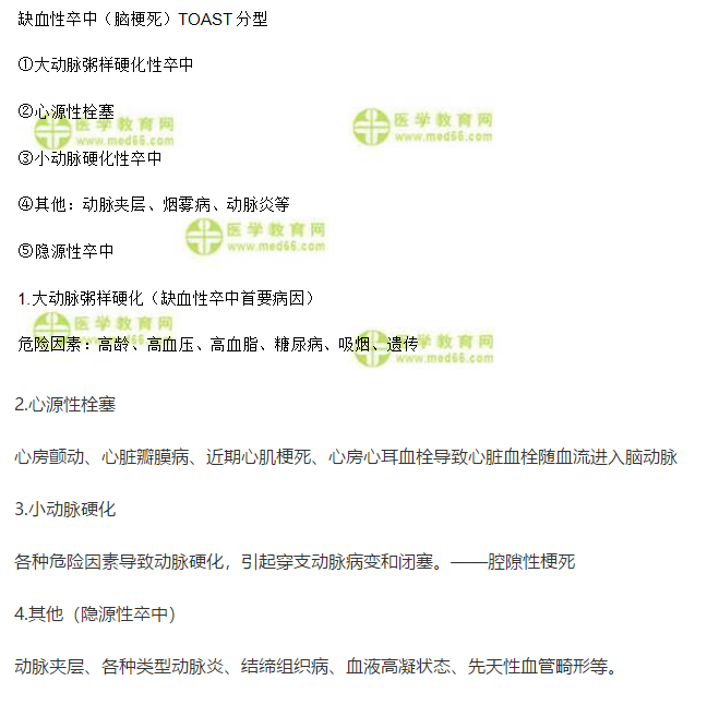 針對(duì)臨床執(zhí)業(yè)醫(yī)師精神神經(jīng)系統(tǒng)中“缺血性卒中的病因、分型”相關(guān)考點(diǎn),相信大家都在認(rèn)真學(xué)習(xí),為提高備考效率,在此醫(yī)學(xué)教育網(wǎng)小編為大家整理如下內(nèi)容: