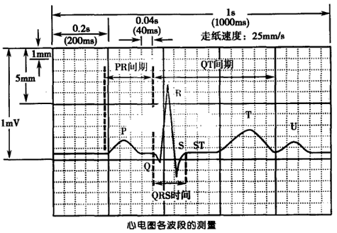 心電圖多描記在特殊的記錄紙上,心電圖記錄紙由縱線和橫線劃分成各為1mm2的小方格。當(dāng)走紙速度為25mm/s時,每兩條縱線間(1mm)表示0.04s(即40ms),當(dāng)標(biāo)準(zhǔn)電壓為1mV=10mm時,兩條橫線間(1mm)表示0.1mV。