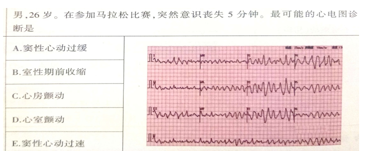 試題2:男,26歲。在參加馬拉松比賽,突然意識喪失5分鐘。最可能的心電圖診斷是(4分)