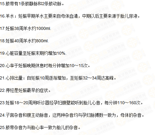 13.胎兒16W末可以鑒別性別;20W末可以聽(tīng)到胎心;24W末可以出現(xiàn)眉毛;28W末可以出現(xiàn)睫毛。