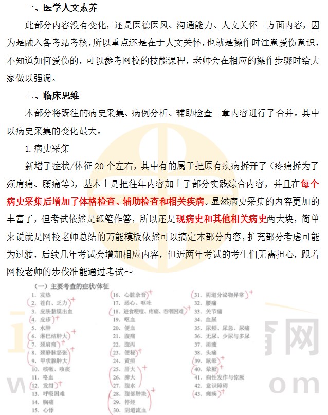 2023年教材為醫(yī)學(xué)人文素養(yǎng)、病史采集、體格檢查、基本操作、輔助檢查、病例分析六個章節(jié),2024年教材將部分內(nèi)容合并,改為了醫(yī)學(xué)人文素養(yǎng)、臨床思維、體格檢查、基本操作四個部分,雖然將病史采集、病例分析、輔助檢查三個章節(jié)合并為臨床思維,但整體技能考試形式較往年不會有太大變化,可參考上個月公布的指導(dǎo)手冊的內(nèi)容進(jìn)行備考,如下圖: