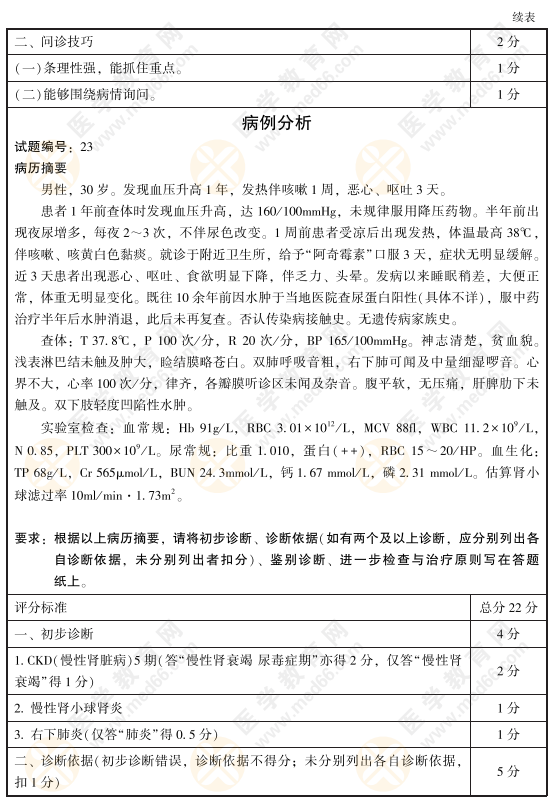 2021年臨床執(zhí)業(yè)醫(yī)師實踐技能考官評分細則——病史采集和病例分析23號練習題