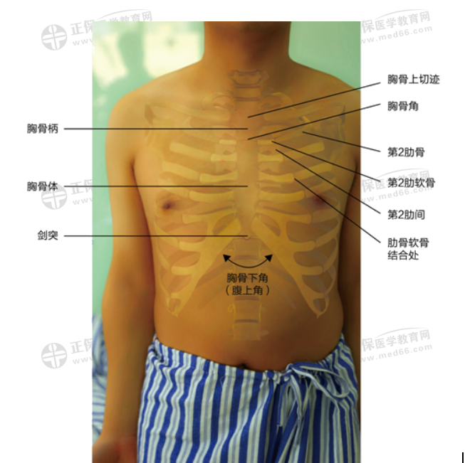 1)胸骨角(Louis角):胸骨柄與胸骨體的連接處,其兩側分別與左右第2肋軟骨相連接。平氣管分叉、心房上緣、上下縱隔交界、第4胸椎下緣。