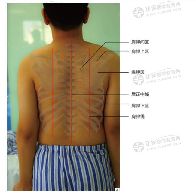 2)肩胛骨:被檢查者雙臂下垂,肩胛下角平第7或第8肋骨水平,或相當于第8胸椎水平。