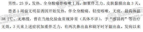 - · 男性,25歲。發(fā)熱、全身酸痛伴咳嗽1周,加重伴乏力、皮膚黏膜出血3天。