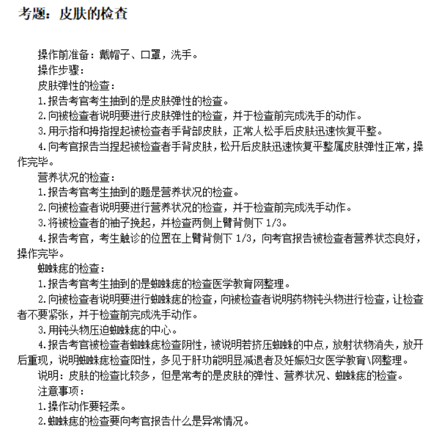 皮膚的檢查步驟及注意事項(xiàng)——臨床醫(yī)師體格檢查歷年考點(diǎn)如下,實(shí)踐技能第二站體格檢查是考試難點(diǎn)之一,為了幫助廣大醫(yī)考生學(xué)習(xí),醫(yī)學(xué)教育網(wǎng)老師專門總結(jié)了“體格檢查”歷年考點(diǎn),預(yù)祝大家都能取得優(yōu)異成績(jī):