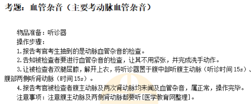 臨床執(zhí)業(yè)醫(yī)師實踐技能第二考站體格檢查歷年考點:血管雜音如下,實踐技能第二站體格檢查是考試難點之一,為了幫助廣大醫(yī)考生學(xué)習(xí),醫(yī)學(xué)教育網(wǎng)老師專門總結(jié)了“體格檢查”歷年考點,預(yù)祝大家都能取得優(yōu)異成績: