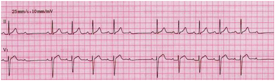 二度Ⅱ型房室傳導(dǎo)阻滯:臨床執(zhí)業(yè)醫(yī)師實踐技能第一站心電圖實戰(zhàn)演練題