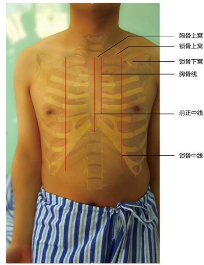 (2)垂直線標志:包括前正中線、鎖骨中線、腋前線、腋中線、腋后線、肩胛下角線(肩胛線)、后正中線。其中標注鎖骨中線時,利用直尺測定鎖骨胸骨端和肩峰端之間的中點,然后用皮尺向下引,測量并記錄左鎖骨中線距前正中線之間的投影距離,作為心臟測量的參照。