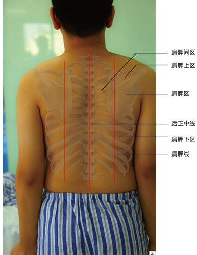 2)肩胛骨:位于后胸壁第2~8肋骨之間,肩胛骨的最下端稱為肩胛下角。被檢查者雙臂下垂,肩胛下角平第7或第8肋骨水平,或相當于第8胸椎水平。