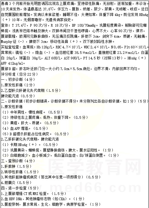 原發(fā)性肝癌考點例題:男性,57歲。右上腹疼痛3個月,發(fā)熱10天。2022年臨床醫(yī)師實踐技能考試正在進行中,醫(yī)學(xué)教育網(wǎng)編輯預(yù)祝各位考生順利參考,取得好成績!