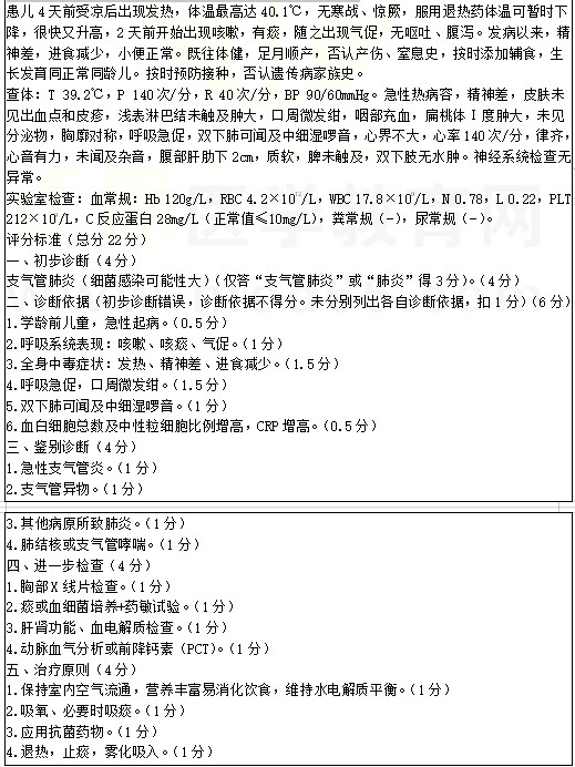 支氣管肺炎考點(diǎn)例題:女孩,3歲半。發(fā)熱4天,咳嗽、氣促2天。2022年臨床醫(yī)師實(shí)踐技能考試正在進(jìn)行中,醫(yī)學(xué)教育網(wǎng)編輯預(yù)祝各位考生順利參考,取得好成績(jī)!