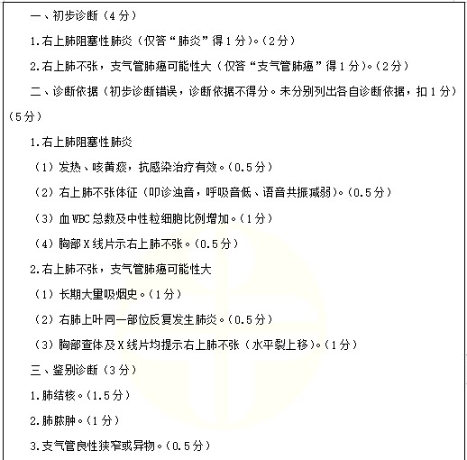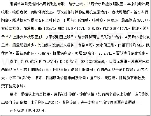 右上肺阻塞性肺炎考點(diǎn)例題:男性,59歲。間斷咳嗽、咳痰伴發(fā)熱半年就診,加重1周。