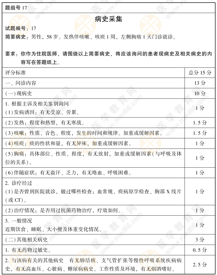 2022年臨床醫(yī)師病史采集+病例分析考前模擬卷第17套(含評分標(biāo)準(zhǔn))如下,2022年臨床執(zhí)業(yè)醫(yī)師實(shí)踐技能考試在即,醫(yī)學(xué)教育網(wǎng)整理了實(shí)踐技能考前指導(dǎo)手冊(查看活動詳情>>),包含技能各站精選模擬試題,查看2022年臨床執(zhí)業(yè)醫(yī)師技能集訓(xùn)營,暢享考前直播課>>