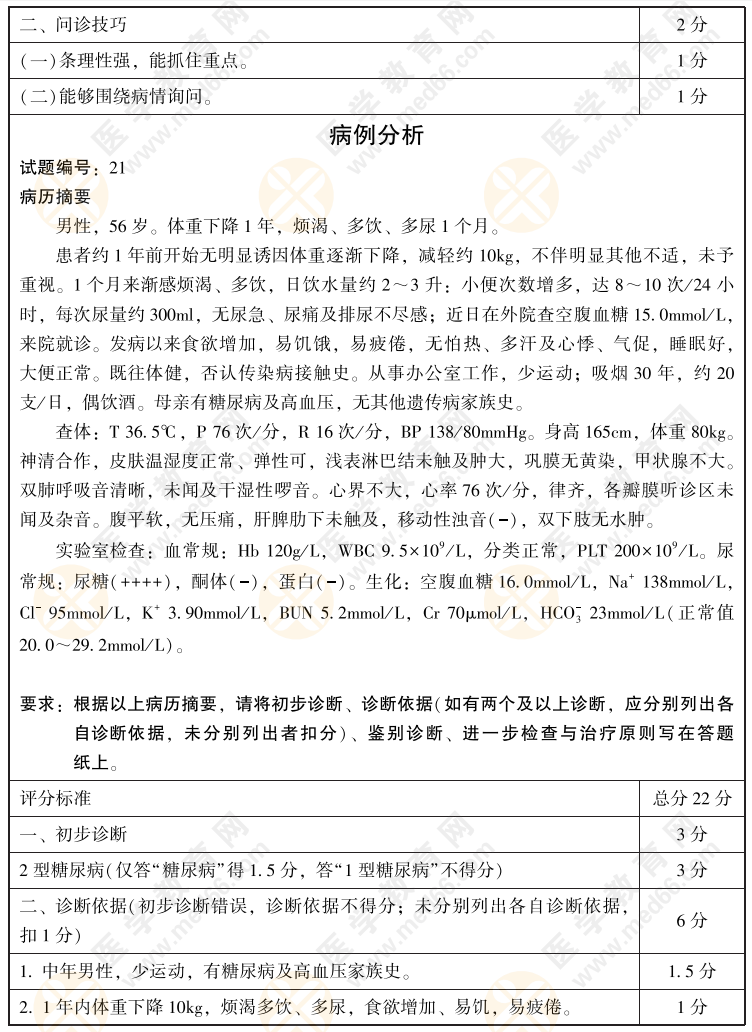 2022年臨床醫(yī)師病史采集+病例分析考前模擬卷第21套(含評(píng)分標(biāo)準(zhǔn))如下,2022年臨床執(zhí)業(yè)醫(yī)師實(shí)踐技能考試在即,醫(yī)學(xué)教育網(wǎng)整理了實(shí)踐技能考前指導(dǎo)手冊(查看活動(dòng)詳情>>),包含技能各站精選模擬試題,查看2022年臨床執(zhí)業(yè)醫(yī)師技能集訓(xùn)營,暢享考前直播課>>