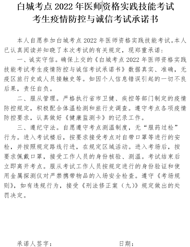 附件下載: 白城考點(diǎn)2022年醫(yī)師資格實(shí)踐技能考試考生疫情防控與誠(chéng)信考試承諾書