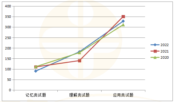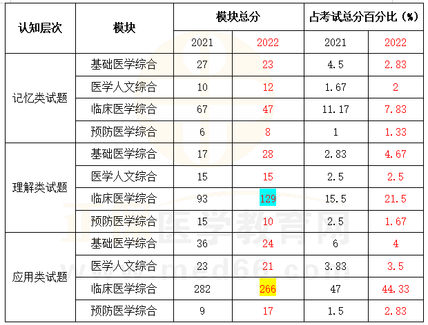 ①可以看出國家醫(yī)學(xué)考試要求的是全面的人才,尤其是“應(yīng)用類”人才,此類題目占總分的54.67%,但對比2021年分值減少22分,“理解類”增多,多了42分。國家開始逐漸看重“理解類”人才,以后的考試趨勢可能會越來越向“理解類”人才靠攏,所以,我們要努力讓自己成為擅于理解并且能合理運用知識的人。